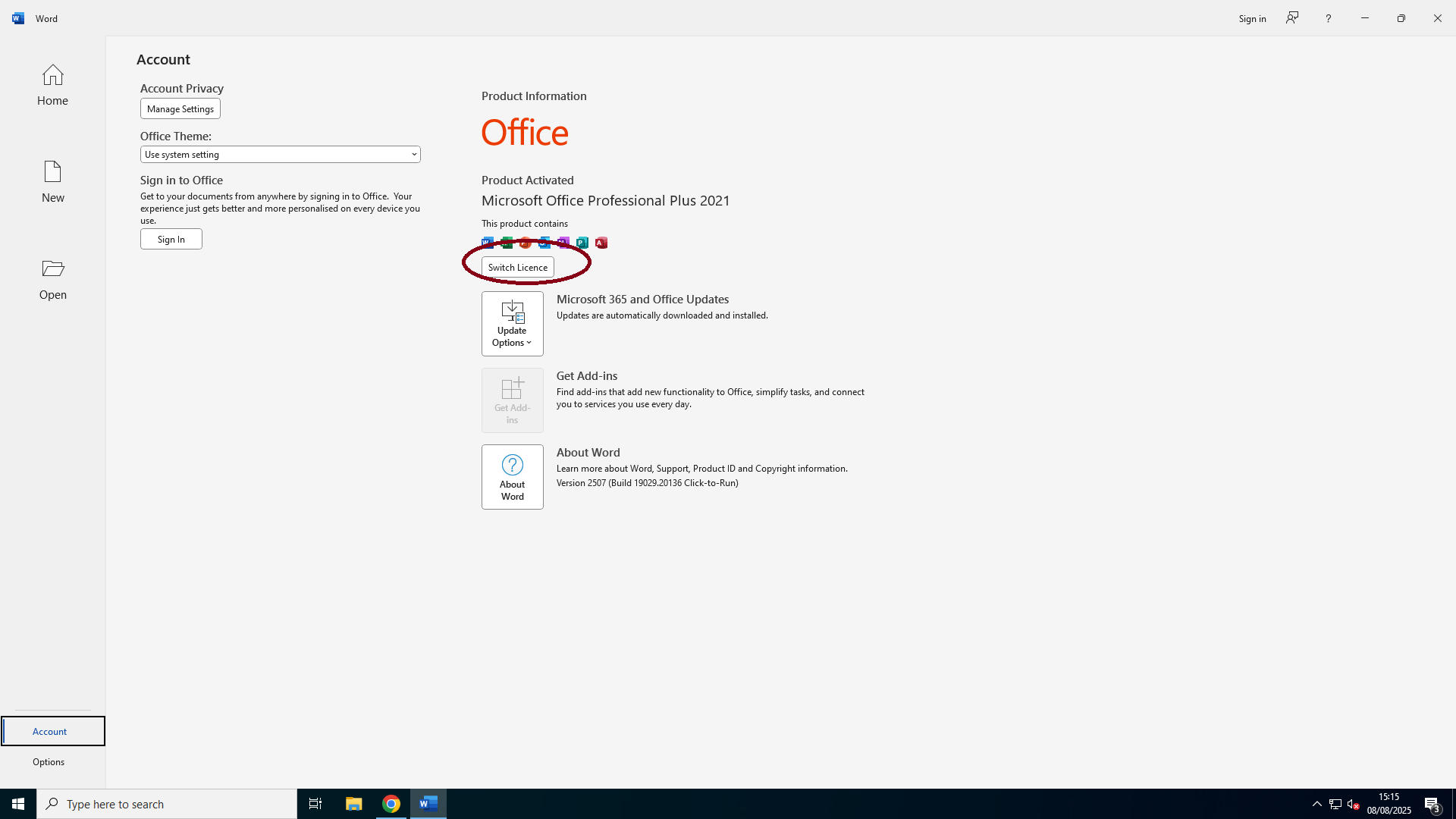 After activation, restart Word and check under File → Account to confirm the new license is applied.